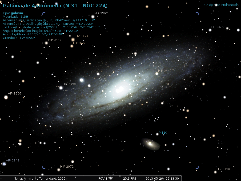 Andrômeda é o nome da nossa galáxia mais proxima a aproximadamente 3 milhoes de anos luz da via lactea. A galáxia da Andromeda (Messier 31, NGC 224) essa galáxia se localiza na constelação da Andrômeda. Andrômeda é a galáxia mais larga do grupo local, que contém a via lactea, a Galáxia do Triangulo,e outras 30 galaxias menores. Embora seja a mais larga não é a mais maciva: sua massa de 7.1 x 1011 é menor do que a via lactea, que contem mais materia escura. Contudo, contém duas vezes mais estrelas do que a nossa Galáxia, que tem aproximadamente meio trilhão de estrelas.Com uma magnitude aparente 3,4, é um dos objetos astronomicos mais brilhantes do catálogo de objetos do céu profundo do astrônomo francês Charles Messier, visível a olho nu na ausência da Lua. Possui entre 180 e 220 mil anos-luz de diâmetro e uma magnitude absoluta de -21,4.